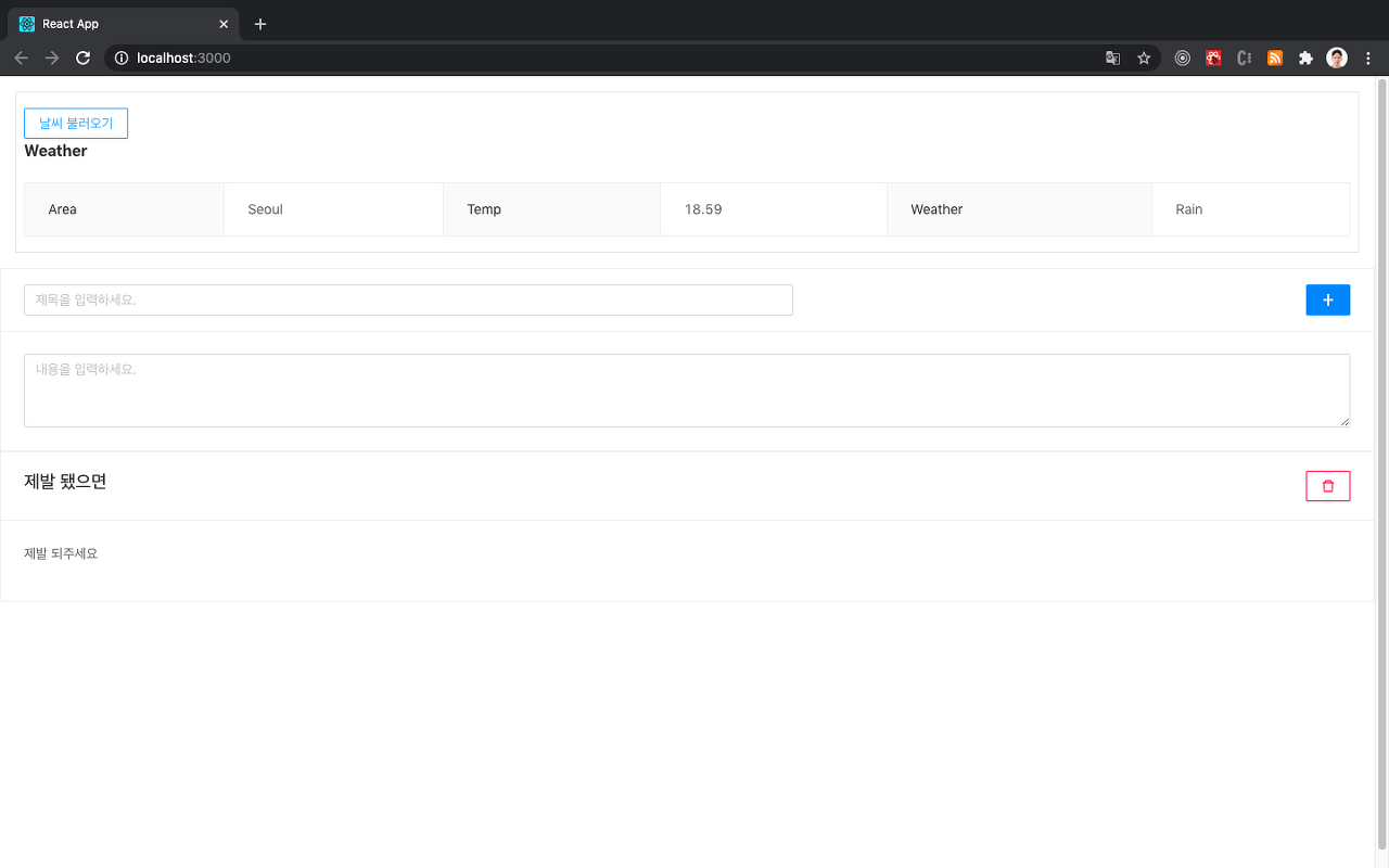 이전 글에서 리덕스를 사용해 노트 앱을 만들어봤는데, 그 노트 앱 위에 현재 날씨를 요청해 데이터를 받아와 출력해주는 작업을 처리해보려고 합니다. 완성된 코드는 아래 링크에 있으니 참고하시길 바랍니다.