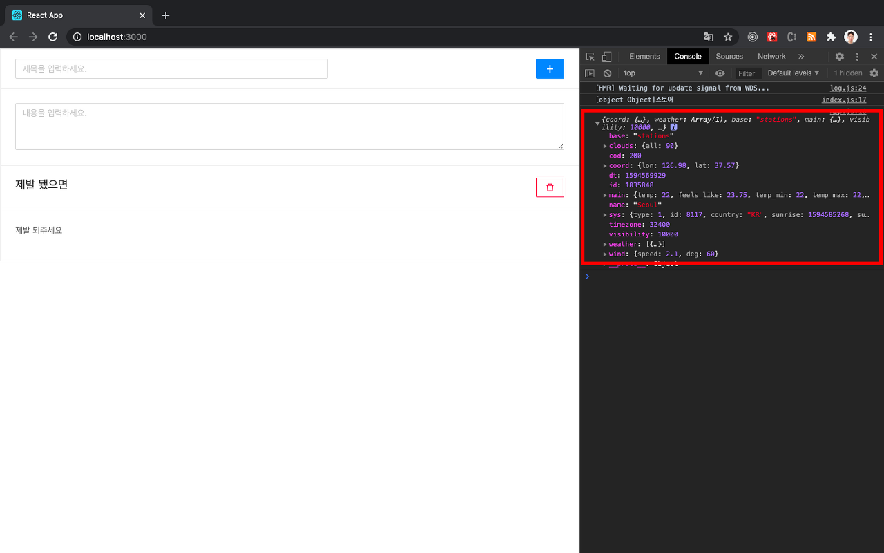 3. 날씨 불어오기 버튼 클릭 후 (성공)