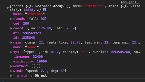 또한, 위 코드에서 성공 시에 action.payload로 전달되는 값은 이전에 콘솔에서 출력했던 값 들일 텐데, 그중, name(지역), temp(온도), weather(날씨)만 사용해 출력하려고 합니다.