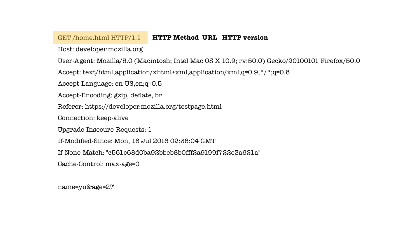 요청 해더의 첫째 줄은 요청행(Request Header)이라 부르며, HTTP 메서드, URL, HTTP 버전이 포함되어 있다.