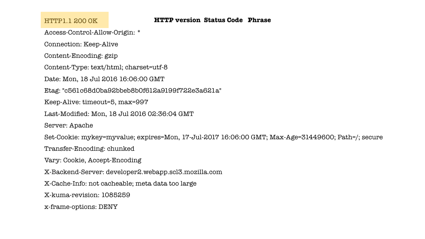 응답 해더의 첫째 줄은 상태를 표현하는 줄이며, HTTP 버전, 상태 코드, 상태 코드에 대한 간단한 설명이 포함되어 있다.