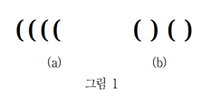 그릇을 바닥에 놓았을 때 그 높이는 10cm 이다. 그런데 두 개의 그릇을 같은 방향으로 포개면 그 높이는 5cm만 증가된다. 만일 그릇이 서로 반대방향으로 쌓이면 높이는 그릇만큼, 즉 10cm 늘어난다. 그릇을 괄호 기호로 나타내어 설명해보자. 편의상 그릇이 쌓여지는 방향은 왼쪽에서 오른쪽이라고 가정한다. 그림에서 ‘(’은 그릇이 바닥에 바로 놓인 상태를 나타내며, ‘)’은 그릇이 거꾸로 놓인 상태를 나타낸다. 만일 그릇이 포개진 모양이 아래 그림 1(